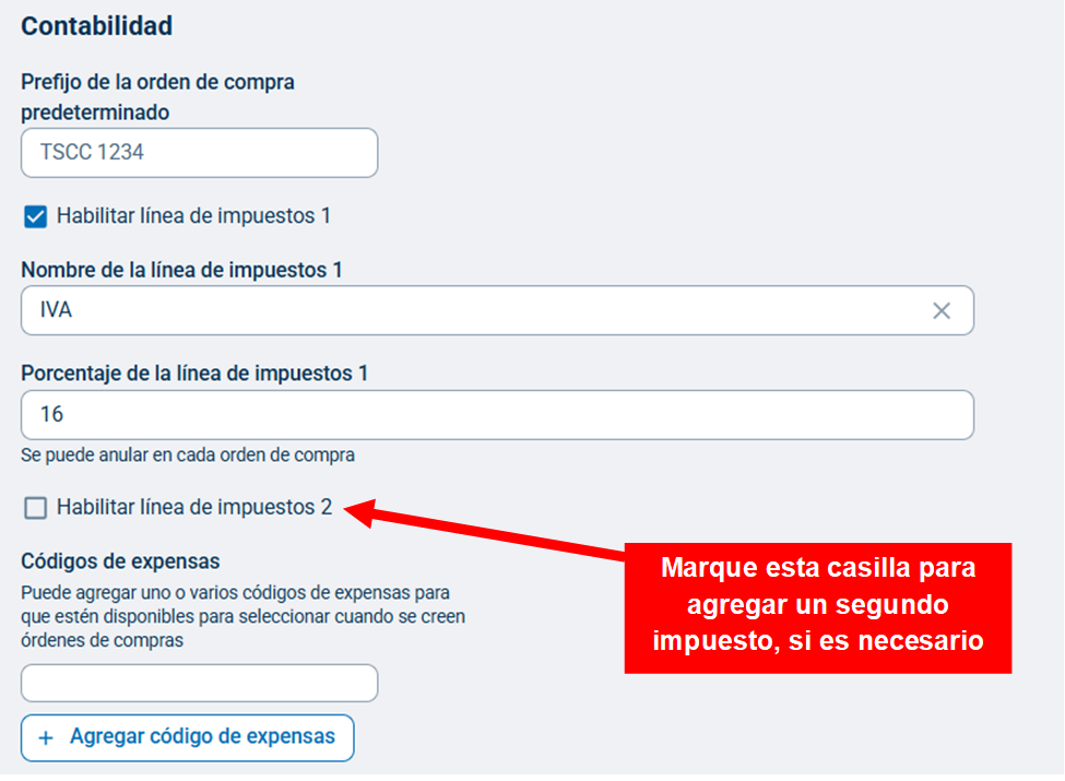 Ingrese la información contable en esta sección, incluidos los prefijos y los códigos de su software contable y la información fiscal. Marque Habilitar línea de impuestos 2 para agregar un segundo impuesto, si fuera necesario.