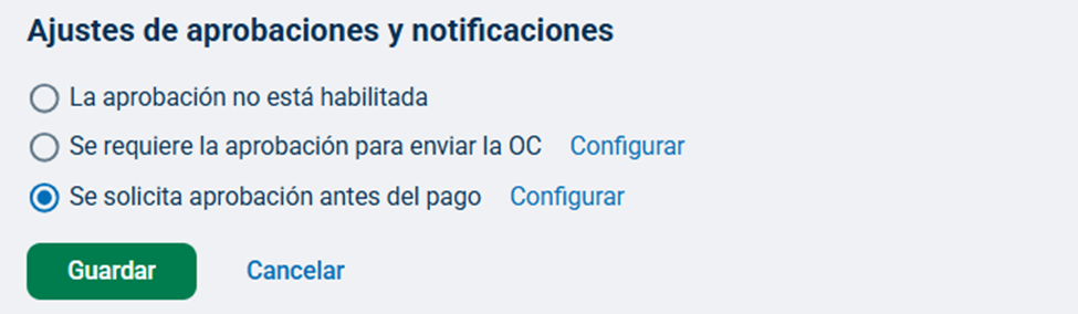 - Se solicita aprobación antes del pago - Con esta configuración, puede crear varios grupos de aprobación para elevar la solicitud.
