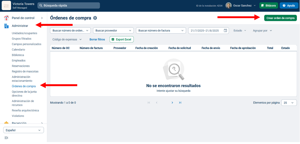 Para crear una orden de compra, haga clic en la pestaña Administrar y seleccione Órdenes de compra. Haga clic en Crear orden de compra.