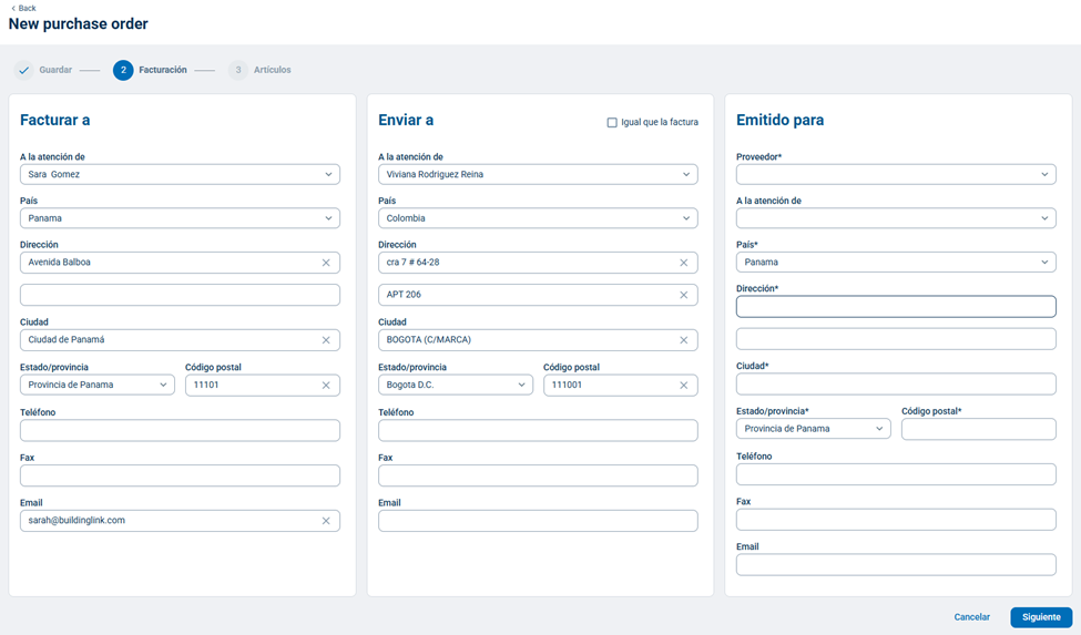 Luego, podrá completar a quién facturar y el lugar de envío, y seleccionar su proveedor. Los proveedores se gestionan en el Directorio de proveedores, que se encuentra en la pestaña de Mantenimiento. Haga clic en Siguiente para continuar.