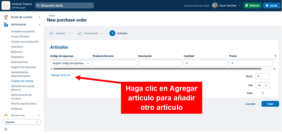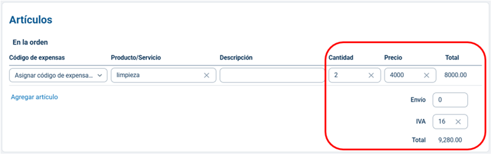 Aquí podrá agregar los artículos a la orden de compra. Complete el código de expensas, el producto o servicio, la descripción (si corresponde), la cantidad y el precio por artículo individual. Haga clic en Agregar artículo para añadir otro artículo a la orden de compra.