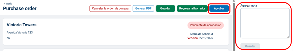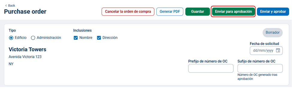 Cuando esté listo para enviar la orden de compra para aprobación, haga clic en Enviar para aprobación. Al hacer clic en Enviar para aprobación, la orden de compra se enviará por correo electrónico automáticamente a quien pueda aprobarla según los ajustes que haya configurado. Una vez que la OC se haya enviado, se modificará a "Pendiente de aprobación".