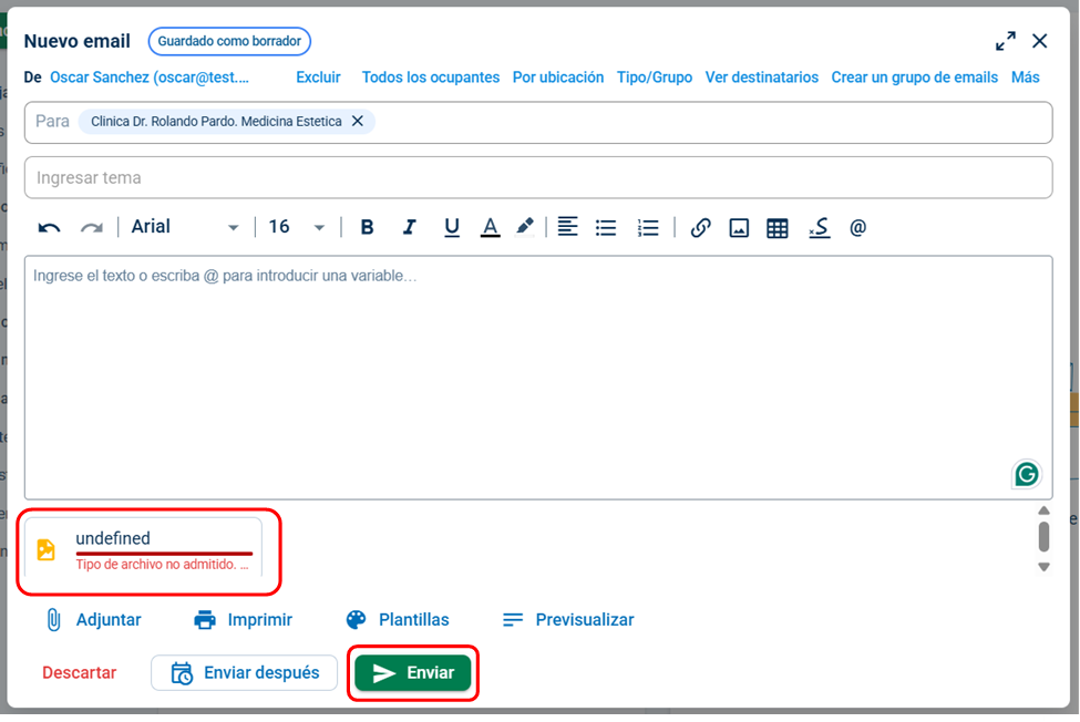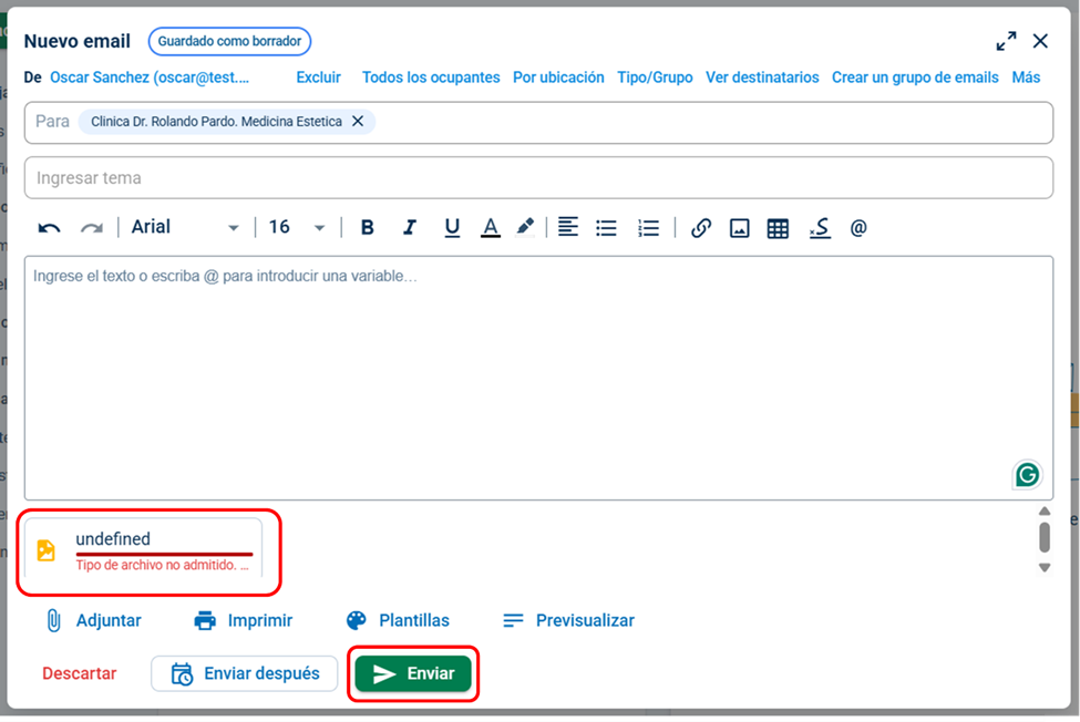 Una vez terminado el borrador de la orden de compra, tendrá la opción de enviar la OC directamente al proveedor haciendo clic en Email para el proveedor. Esto adjunta automáticamente la OC como un archivo PDF en la página "Redactar email" de BuildingLink, donde puede enviar la OC por correo electrónico al proveedor y a otras personas.
