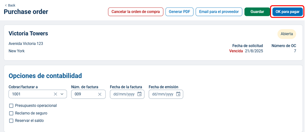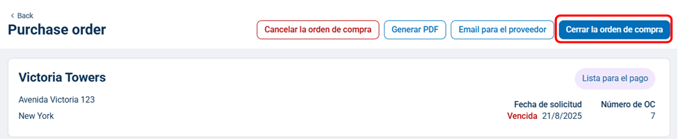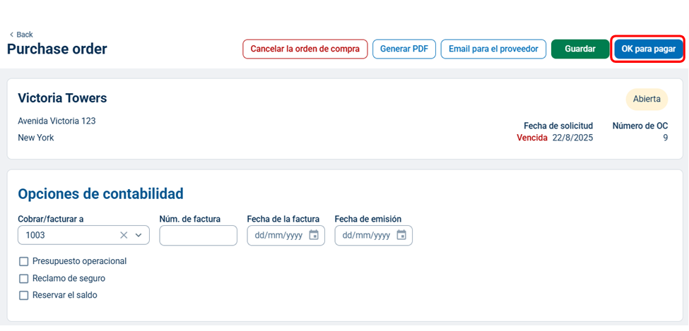 La OC se mostrará como "OK para pagar". Al hacer clic en Cerrar la orden de compra, se guardará una copia permanente de la orden de compra, y se eliminará la opción de cancelarla. Sin embargo, puede agregar notas al registro de actividades incluso después de que la orden de compra se marque como "Cerrado".