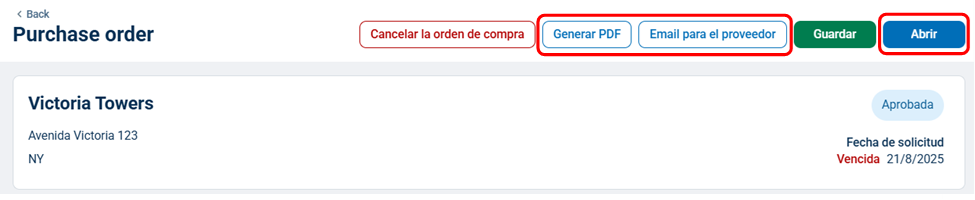 Si prefiere entregar la OC personalmente o enviarla por correo postal, puede generar un PDF e imprimirlo. Si elige esta opción, simplemente haga clic en Abrir para indicar que la OC se ha enviado al proveedor, y que está listo para pasar al siguiente paso.