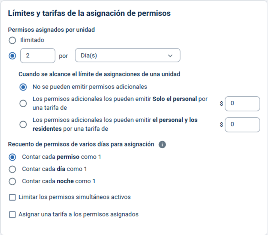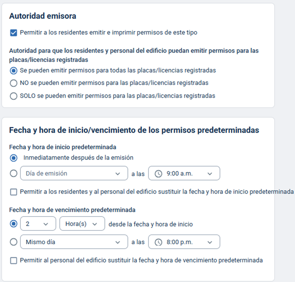 - Permitir a los residentes emitir e imprimir permisos de este tipo: Define si los residentes pueden emitir e imprimir este tipo de permiso específico.