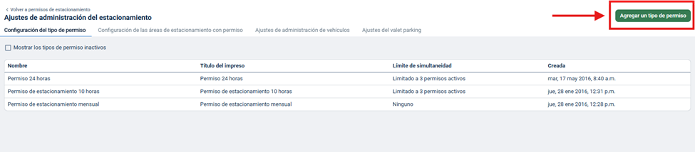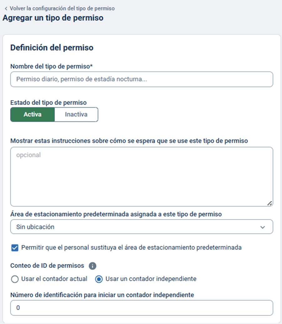 - Nombre del tipo de permiso: Define el nombre del permiso de estacionamiento.