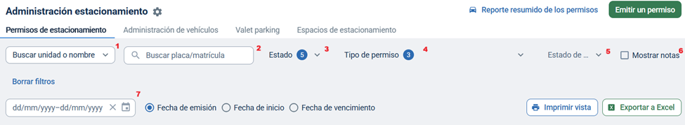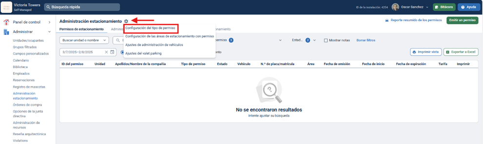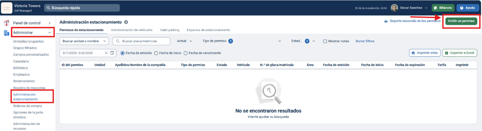 Para emitir un nuevo permiso, vaya a Administrar, seleccione Administración estacionamiento y haga clic en Emitir un permiso.