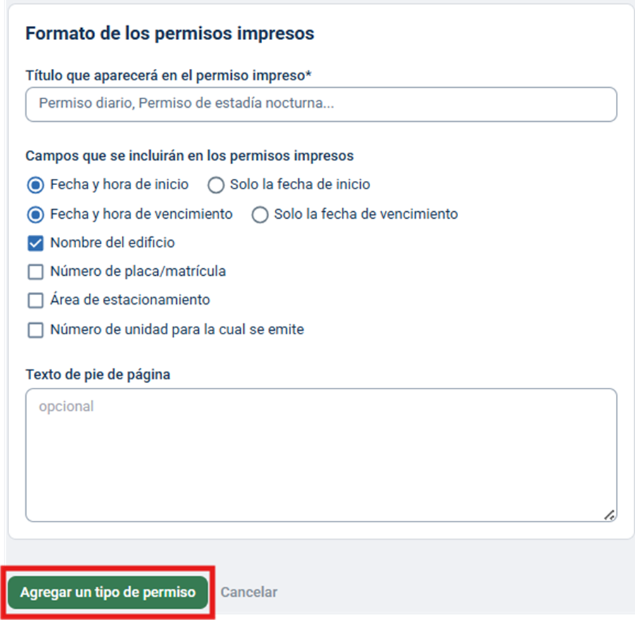 - Texto de pie de página: Define qué texto de pie de página aparecerá en el tipo de permiso impreso.