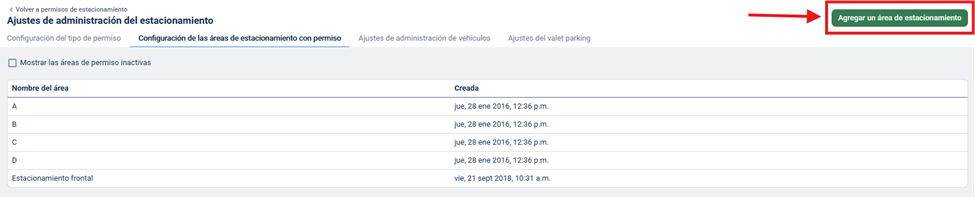 Si tiene una o más áreas de estacionamiento con permiso disponibles, puede añadirlas como áreas separadas. Para ello, vaya a Administrar, seleccione Administración estacionamiento, haga clic en el ícono de Ajustes y seleccione Configuración de las áreas de estacionamiento con permiso. Para añadir una nueva área de estacionamiento, haga clic en Agregar un área de estacionamiento, y escriba el nombre del área en el campo de texto. Cuando termine, haga clic en Agregar un área de estacionamiento.