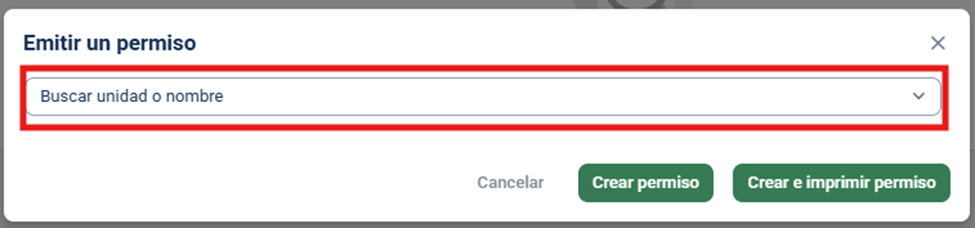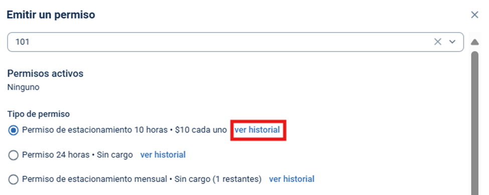 Luego, ingrese el número de la unidad para la que se emitirá el permiso y seleccione el tipo de permiso que corresponda en Tipo de permiso. También podrá ver el número de asignaciones de cada tipo de permiso que le quedan a la unidad seleccionada. Si quiere ver el historial de permisos del tipo seleccionado de la unidad, haga clic en ver historial.
