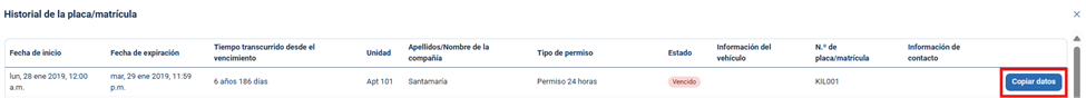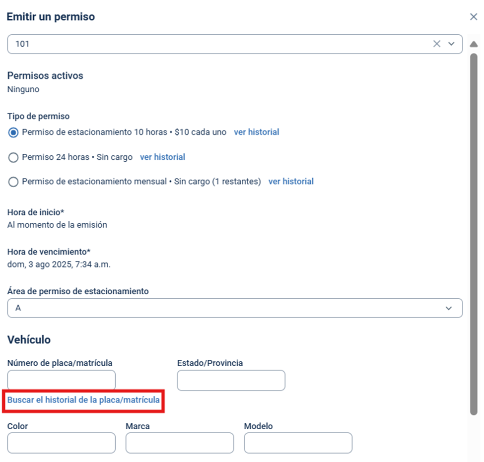 Nota: Para volver a emitir rápidamente un permiso de estacionamiento para la misma persona o el mismo vehículo, ingrese el número de placa o matrícula y seleccione Buscar el historial de la placa/matrícula. Haga clic en Copiar datos para completar el nuevo permiso con la información del vehículo del permiso anterior.