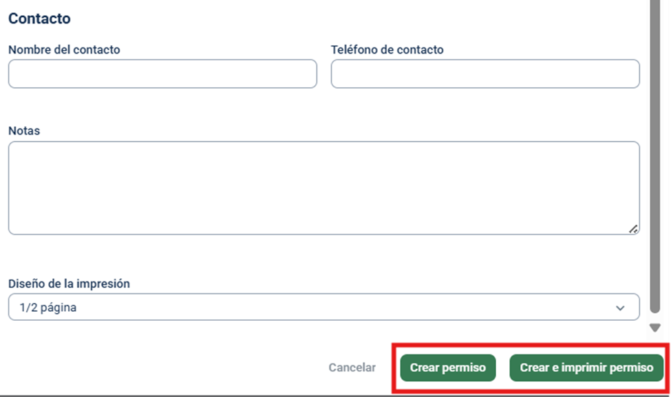 Cuando esté conforme con el permiso, haga clic en Crear permiso (si no necesita una copia impresa) o en Crear e imprimir permiso (si quiere crear e imprimir el permiso).