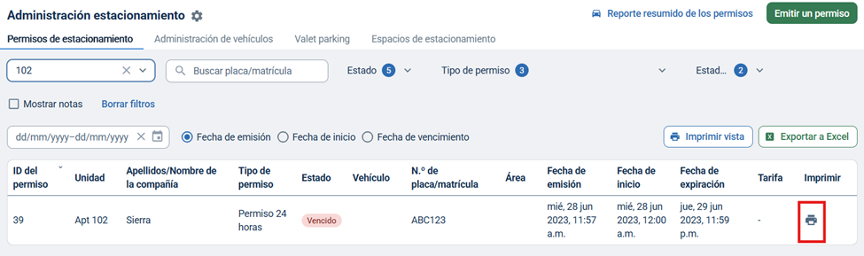 Para ver los permisos de estacionamiento vigentes o pasados o para imprimir/reimprimir los permisos emitidos, vaya a Administrar y seleccione Administración estacionamiento. Para imprimir un permiso, haga clic en el ícono de la impresora, al lado del registro del permiso.