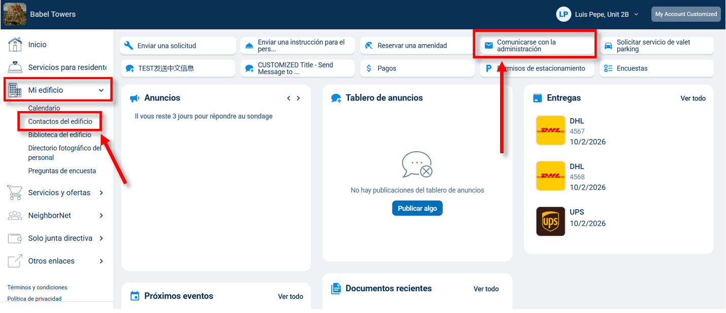 Cualquier pregunta, problema y/o inquietud que no esté específicamente relacionado con el sistema BuildingLink debe abordarse directamente con la administración de su edificio. A continuación, verá capturas de pantalla para saber dónde encontrar la información de contacto de la administración de su propiedad en BuildingLink.