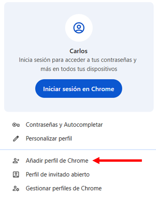 Para agregar un perfil nuevo a Google Chrome en su equipo, abra Chrome, seleccione Perfil en la parte superior derecha, y luego, Añadir perfil.
