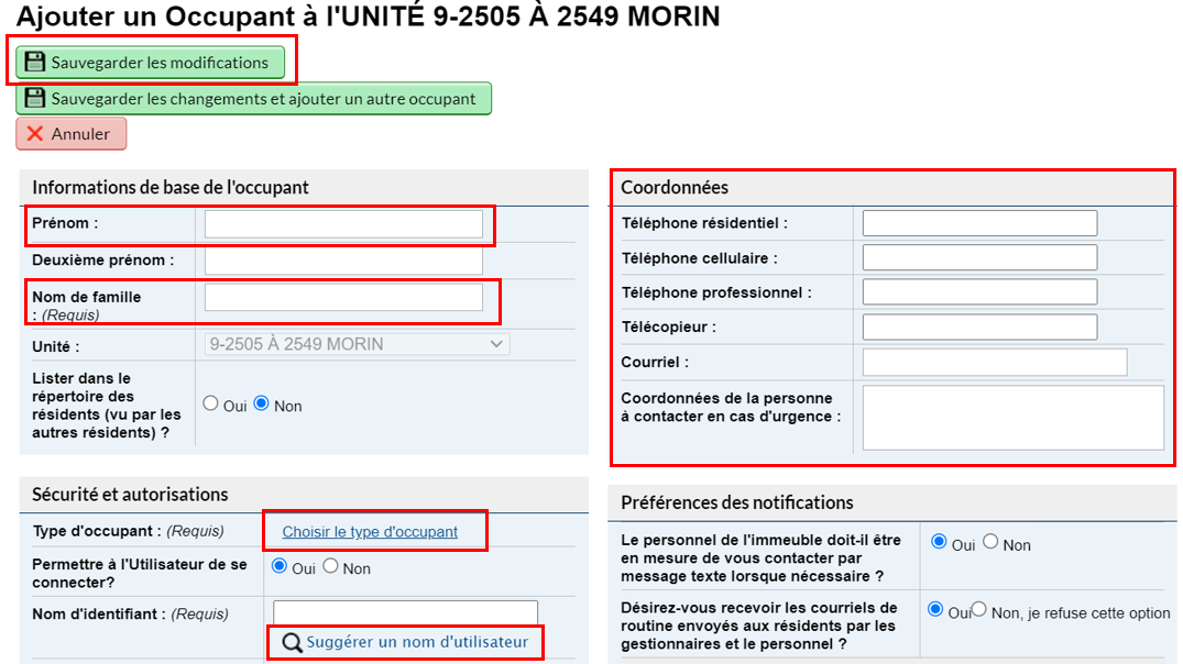 4. Inscrivez le prénom et le nom de famille du nouvel occupant de deuxième niveau. Entrez ses coordonnées dans la section « Coordonnées ». Cliquez sur Choisir le type d’occupant et sélectionnez le type d’occupant correct sous « Types d’occupants de deuxième niveau ». Cliquez sur Suggérer le nom d’utilisateur afin que le système remplisse un nom d’utilisateur pour le résident. Cliquez sur Sauvegarder les modifications.