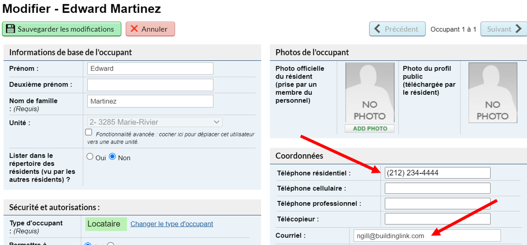 Vous serez amené au profil de l’occupant, où vous pourrez modifier les informations saisies précédemment (comme l’adresse courriel et le numéro de téléphone de l’occupant) ou entrer de nouvelles informations. Vous pouvez également modifier le type d’occupant du résident. Cliquez sur Sauvegarder les modifications.