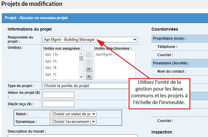Bon nombre des projets de rénovation que vous devez suivre peuvent concerner l’immeuble lui-même : rénovation du hall, travaux sur l'extérieur de l’immeuble, aménagement paysager, etc. Comme toujours, plutôt que de sélectionner l'unité d'un résident en tant que « responsable du projet », vous pouvez sélectionner l'Unité de Gestion, qui représente tout espace non résidentiel de votre immeuble.