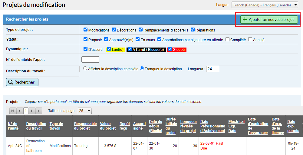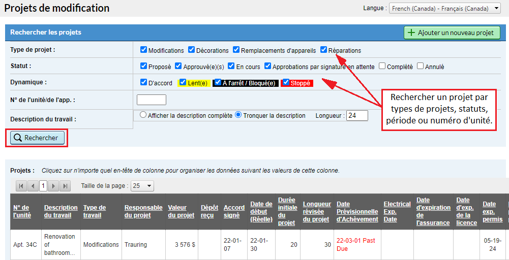 Dans l'onglet Autre, vous pouvez sélectionner Modifications pour afficher tous les projets de rénovation jamais enregistrés dans votre immeuble. Par défaut, le statut «Complété» ne sera pas sélectionné afin de vous donner la vue la plus à jour des projets en cours, mais vous pouvez simplement cocher Complété dans le panneau Rechercher des projets en haut de la page, puis cliquer sur le bouton Rechercher si vous souhaitez voir les rénovations passées. Vous pouvez également utiliser ce panneau de recherche pour isoler des projets pour une unité spécifique ou pour voir un type de projet à la fois (c'est-à-dire uniquement des réparations plutôt que des décorations).