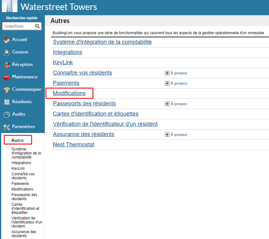 AperçuLe module Modifications vous permet de suivre l'avancement et les détails de tout projet de rénovation, de décoration ou de modification autour d’un immeuble. Par exemple, si deux unités de votre immeuble sont combinées, ce module vous permettra de compiler les détails de ce projet de construction en un seul endroit pratique. |