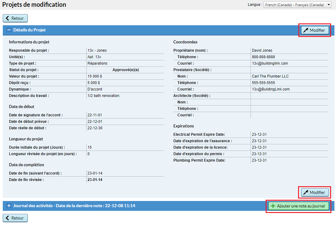 Dans l'onglet Autre, sélectionnez Modifications, puis cliquez sur l'un des projets affichés sur la grille. Cela vous amène à une page à partir de laquelle vous pouvez soit modifier les détails du projet, en utilisant le bouton Modifier en haut à droite, soit ajouter une note au journal, en utilisant le bouton en bas à droite.