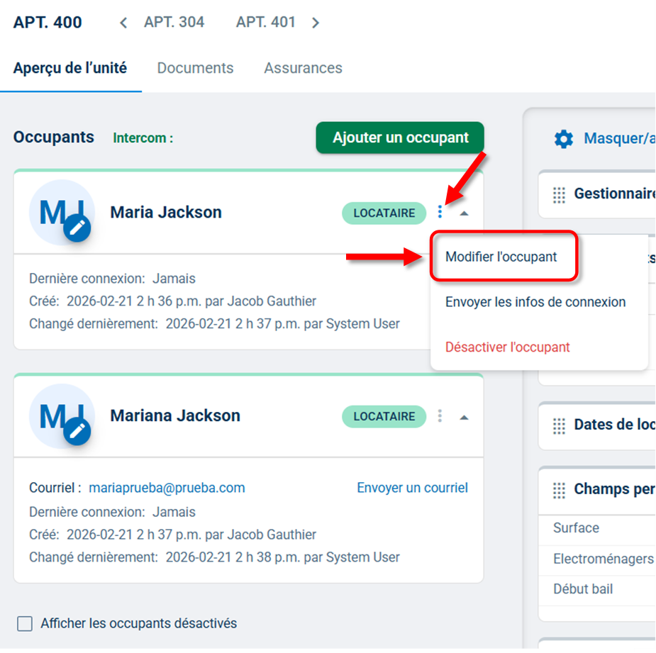Utilisez la Recherche rapide pour saisir le prénom et le nom du résident ou le numéro de l’unité, puis sélectionnez l’unité pour ouvrir la page Aperçu de l’unité. Cliquez sur les trois points situés à droite du type d’occupant de la personne que vous souhaitez modifier, puis cliquez sur Modifier l’occupant.
