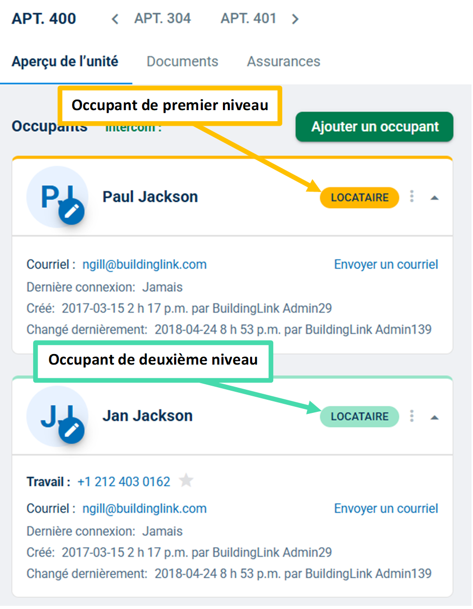 BuildingLink distingue deux principaux types d’occupants : ceux de premier niveau et ceux de deuxième niveau.