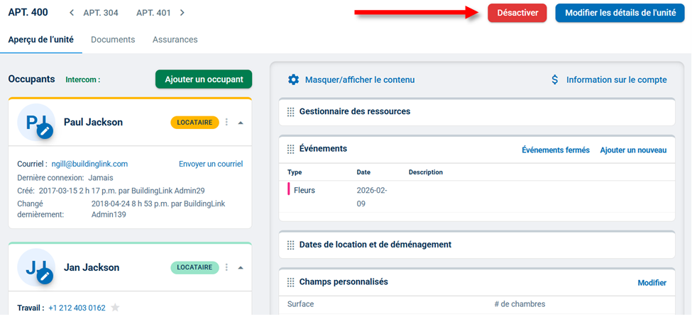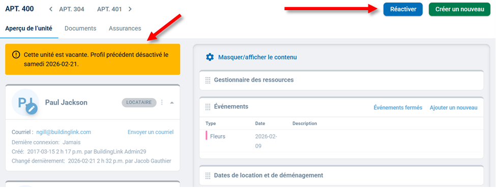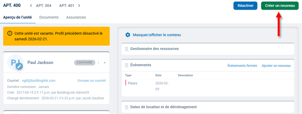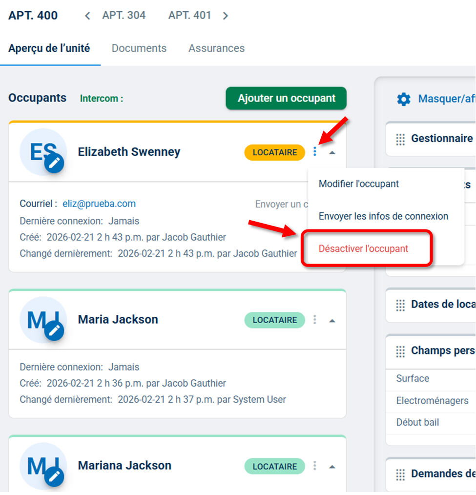 Commencez par supprimer l’ancien occupant principal de premier niveau en désactivant le profil de son unité. Ainsi, l’ensemble de ses informations sera archivé dans votre base de données.
