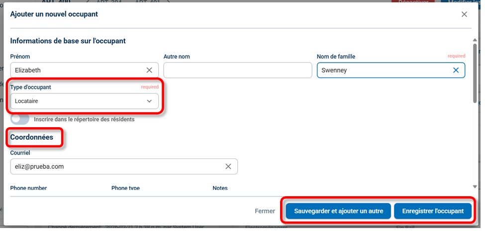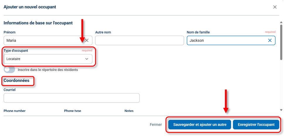 Ensuite, cliquez sur le bouton vert Créer un nouveau pour créer un nouveau profil du nouvel occupant principal de premier niveau (copropriétaires ou titulaires du bail pour un immeuble locatif). Dans la section Ajouter un nouvel occupant, choisissez le type d’occupant dans le menu déroulant, puis saisissez son nom et son prénom. Entrez ses coordonnées dans la section Coordonnées.