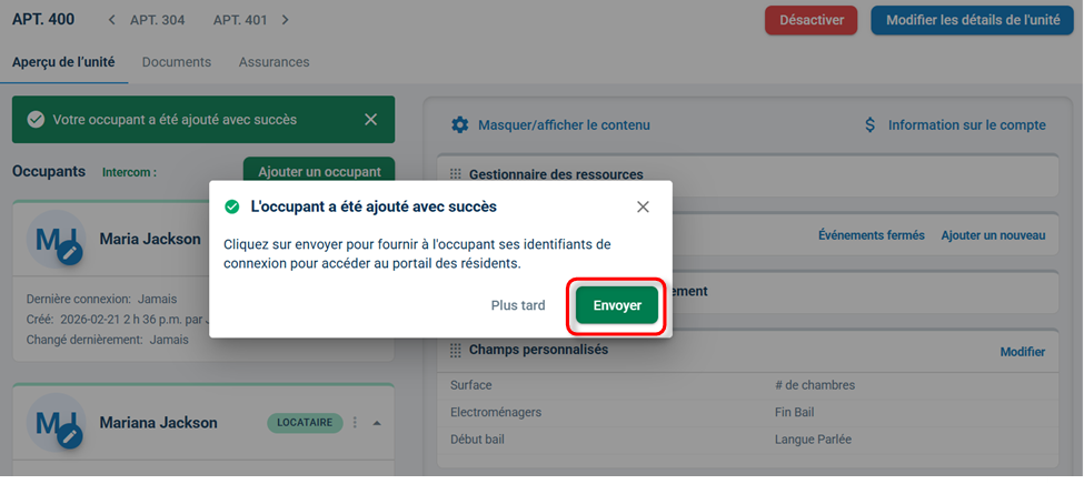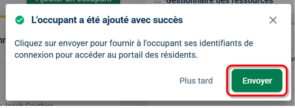 Pour ajouter uniquement cet occupant, cliquez sur Enregistrer l'occupant. Cliquez sur Enregistrer et ajouter un autre pour ajouter d'autres occupants. Une fois que vous aurez ajouté tous les occupants, vous serez invité à leur envoyer leurs identifiants de connexion. Cliquez sur le bouton vert Envoyer pour le faire immédiatement, ou sur Plus tard si vous souhaitez les leur envoyer ultérieurement.