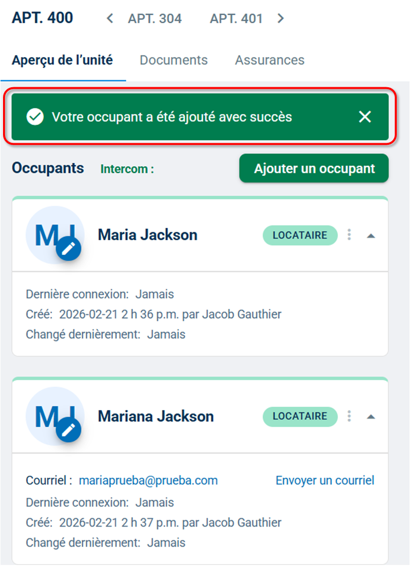 Note: Lorsqu’un Occupant de deuxième niveau est lié à une unité, BuildingLink enverra toutes les notifications automatiques (pour les colis, les demandes d’entretien, les réservations d’installations, etc.) à cette personne, et NON à l’Occupant de premier niveau, qui est présumé ne pas résider dans l’immeuble.