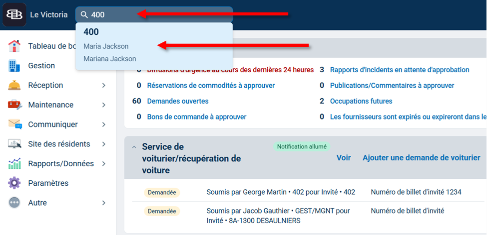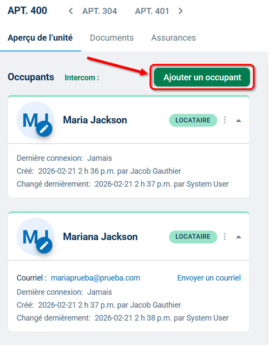 Utilisez la Recherche rapide pour saisir le prénom et le nom du résident ou le numéro de l’unité, puis sélectionnez l’unité afin d’ouvrir la page Aperçu de l’unité. Cliquez ensuite sur Ajouter un occupant.