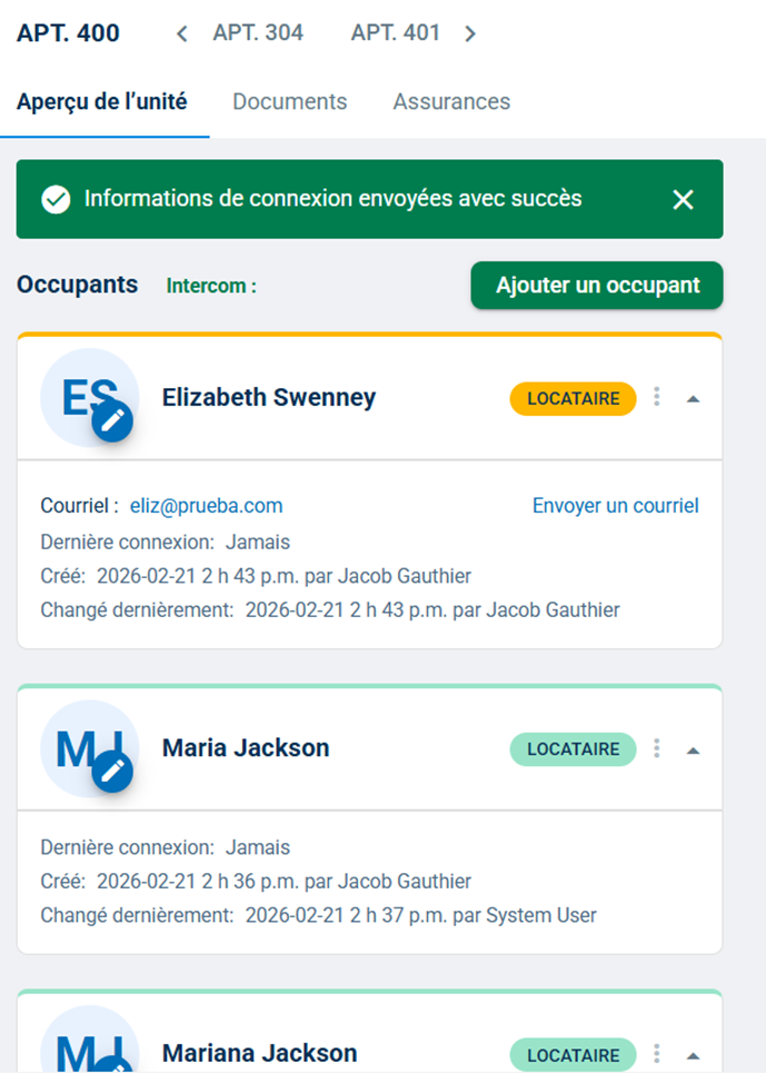 Ensuite, sélectionnez le Type d’occupant dans le menu déroulant, puis saisissez le prénom et le nom du nouvel occupant. Entrez ses coordonnées dans la section Coordonnées. Cliquez sur Enregistrer l’occupant pour ajouter uniquement cet occupant, ou sur Sauvegarder et ajouter un autre pour ajouter d’autres occupants. Après avoir ajouté tous les occupants, vous recevrez un message vous invitant à leur transmettre leurs identifiants de connexion. Cliquez sur le bouton vert Envoyer pour les transmettre immédiatement, ou sur Plus tard si vous souhaitez les envoyer ultérieurement.