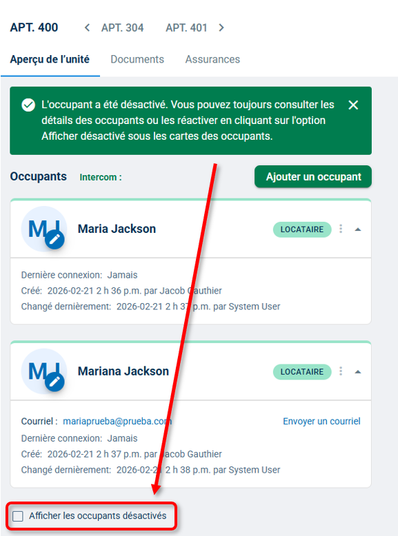 Utilisez la Recherche rapide pour saisir le prénom et le nom du résident ou le numéro de l’unité, puis sélectionnez l’unité afin d’ouvrir la page Aperçu de l’unité. Cliquez sur les trois points situés à droite du Type d’occupant de la personne qui quitte les lieux, puis cliquez sur Désactiver l’occupant. Lorsque le message de confirmation s’affiche, cliquez sur Continuer. Vous recevrez une confirmation indiquant que l’occupant a été désactivé. Vous pourrez ensuite afficher ou réactiver les occupants désactivés en cochant la case Afficher les occupants désactivés.