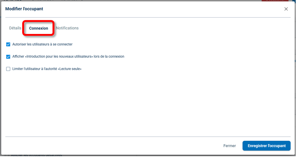 Cliquez sur l’onglet Connexion pour modifier les autorisations de connexion de l’occupant ainsi que les paramètres d’introduction des nouveaux utilisateurs. Cliquez sur l’onglet Notifications pour modifier les préférences de notification de l’occupant (il peut également les gérer lui-même).