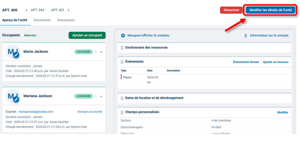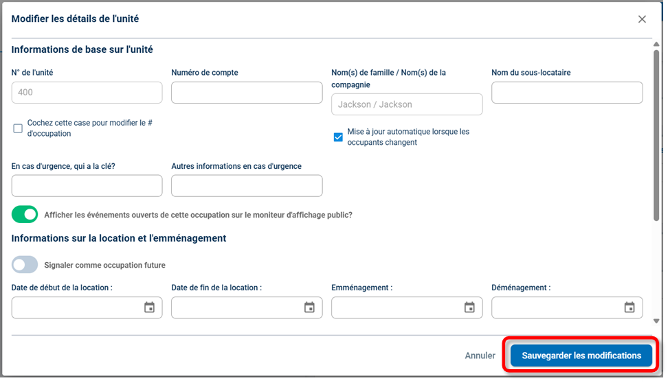 Suivez les étapes ci-dessous pour modifier les informations sur l’occupation d’une unité. Par exemple, vous pouvez modifier l’adresse postale secondaire d’un copropriétaire ou les dates de début et de fin du bail du titulaire principal de bail (dans le cas d’un immeuble locatif). Les informations figurant dans les détails de l’unité seront également archivées lorsque l’occupant principal de premier niveau déménage, en désactivant son profil d’unité.