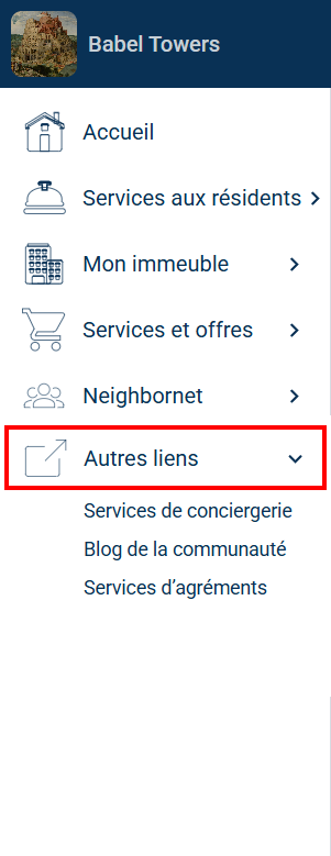 Les liens personnalisés du portail des résidents permettent aux agents directeurs et aux utilisateurs ayant un niveau de gestion d’ajouter des liens vers des sites externes sur le Portail des résidents. Vous pouvez utiliser jusqu’à 10 liens personnalisés pour rediriger les résidents vers des portails de paiement de loyer ou de charges (HOA), des sites de gestion ou de marketing, des sites de commodités et services, des sites communautaires et plus encore.