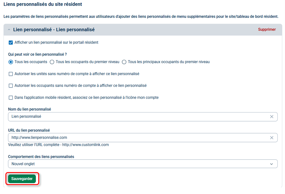 - Afficher un lien personnalisé sur le portail des résidents : permet d’activer ou de désactiver l’affichage du lien personnalisé sur le portail des résidents.