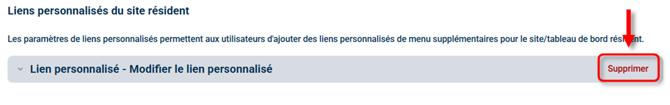 Pour ajouter un lien personnalisé, cliquez sur Paramètres, sélectionnez Liens personnalisés du site résident, puis cliquez sur + Ajouter un autre lien personnalisé.