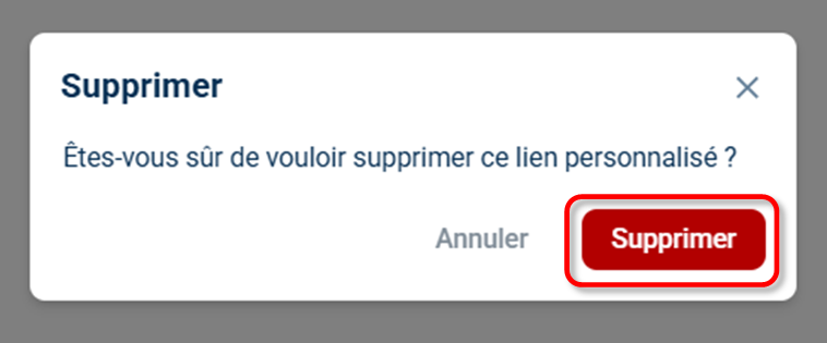 Pour supprimer un lien personnalisé du portail des résidents, cliquez sur Supprimer. Une fenêtre de confirmation s’affichera avec le message : « Êtes-vous sûr de vouloir supprimer ce lien personnalisé ? ». Cliquez sur Supprimer pour confirmer.