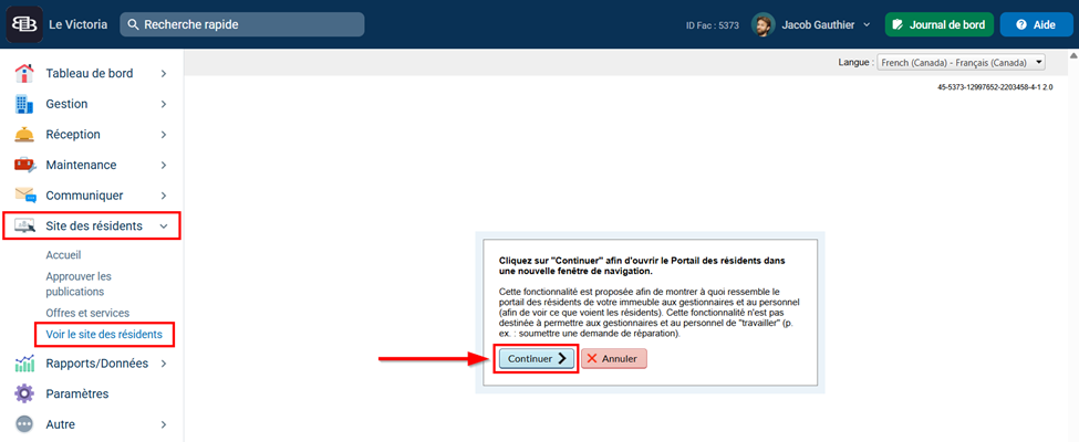 Pour consulter vos liens personnalisés sur le Site des résidents, cliquez sur l’onglet Site des résidents dans le menu à gauche de votre écran. Ensuite, sélectionnez Voir le site des résidents, puis cliquez sur Continuer pour ouvrir le Portail des résidents dans un nouvel onglet de votre navigateur. Cliquez ensuite sur le menu Autres liens pour afficher la liste de tous vos liens personnalisés disponibles. Cliquez sur le lien personnalisé auquel vous souhaitez accéder pour être redirigé vers la page correspondante.